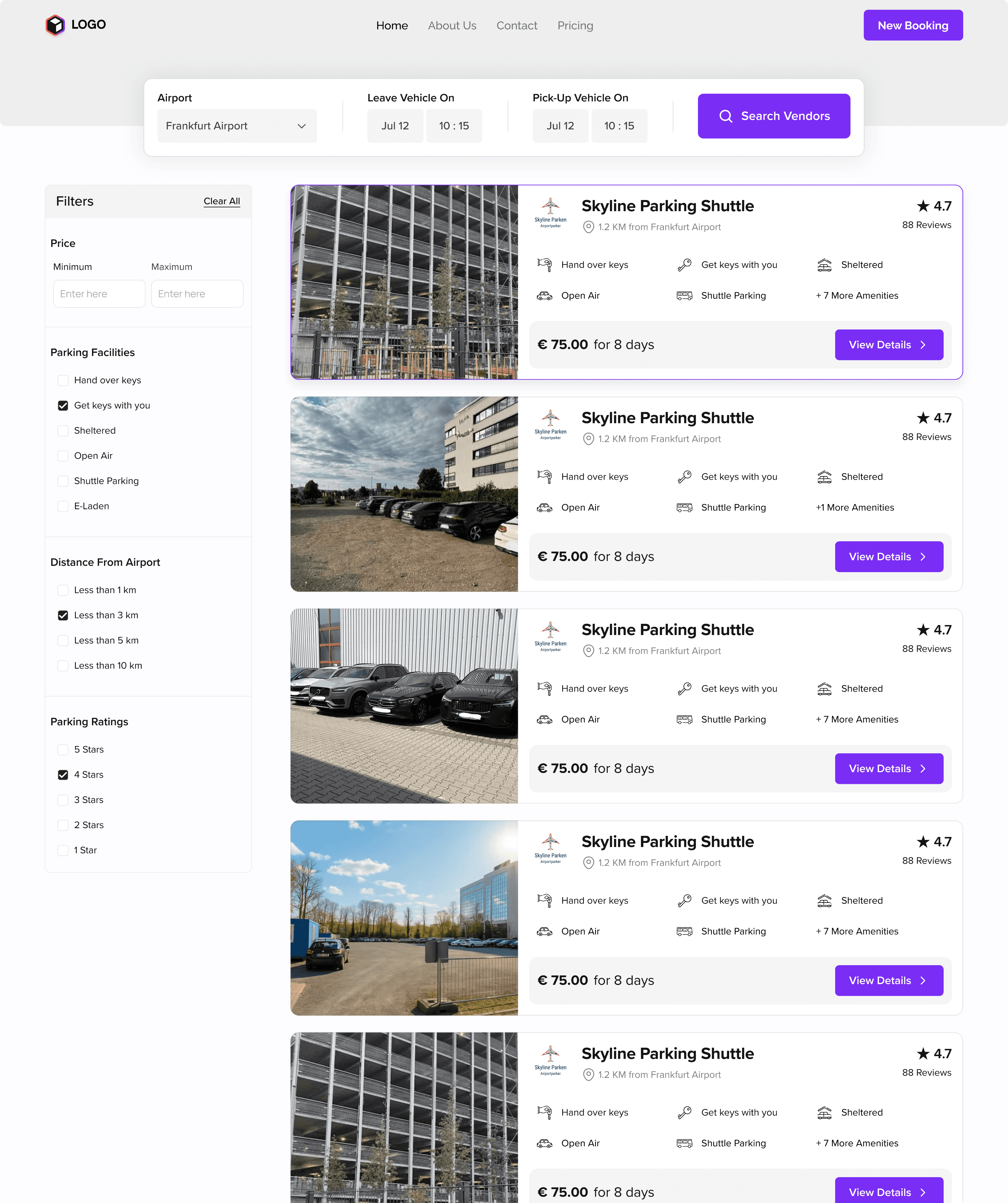 I also implemented Visual Facility Icons (keys for valet, a roof for sheltered, a van for shuttle) to replace long text lists, allowing for faster comparisons on mobile and desktop.
