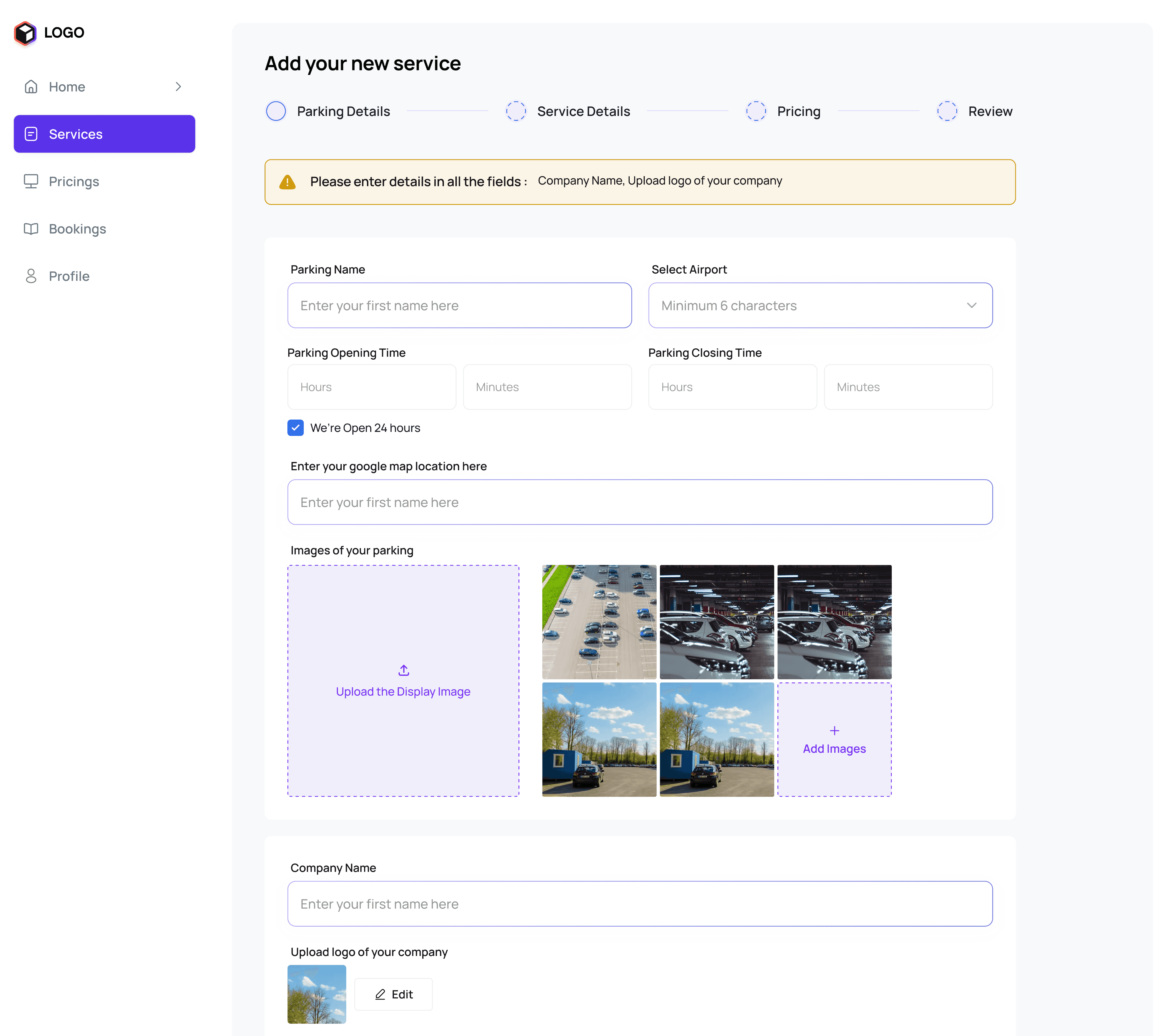 Designing a complex "Add Your Service" flow for parking owners that required business details, opening times, airport proximity, and high-quality photo uploads without being overwhelming.