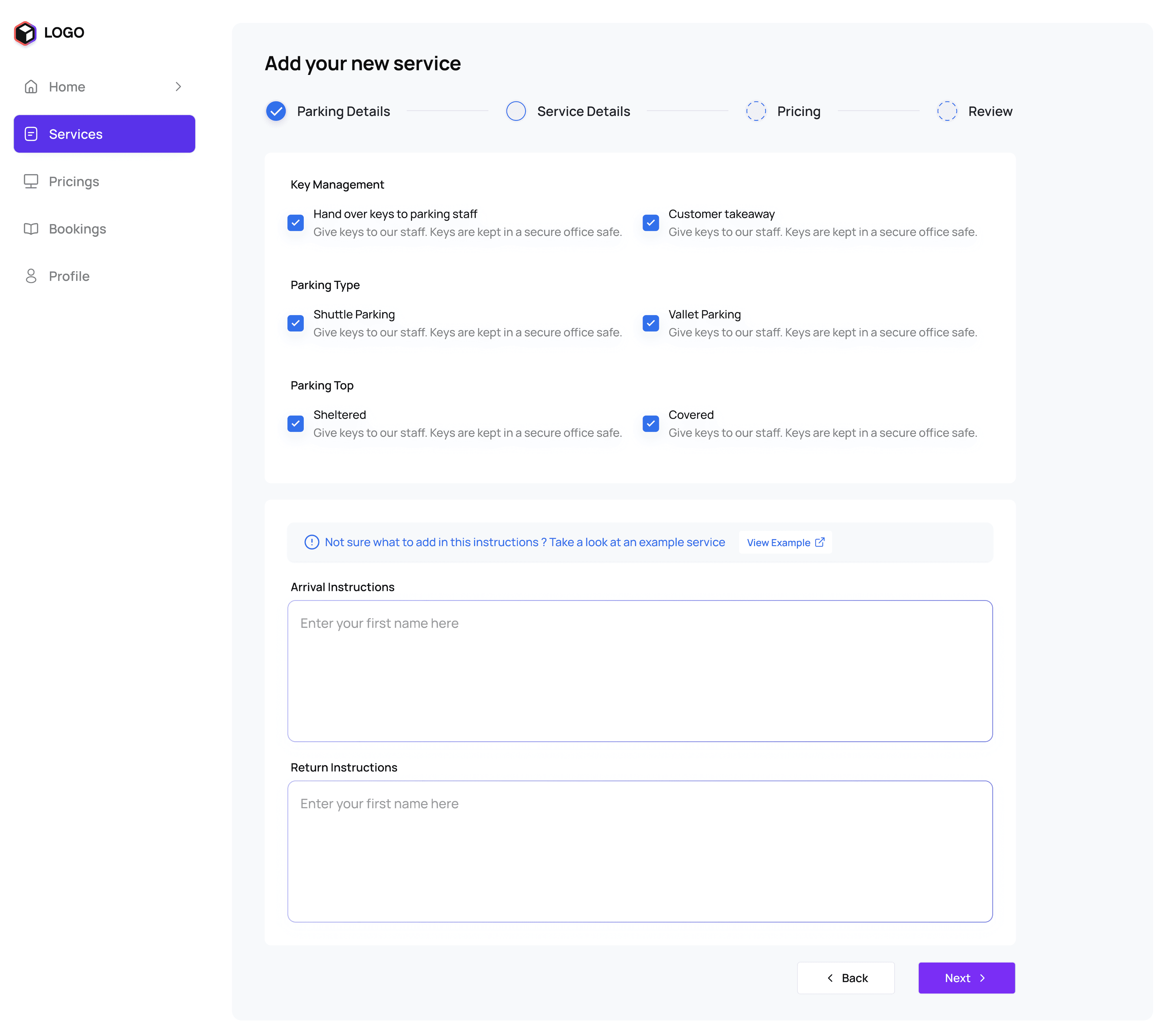 To address vendor friction, I designed a Linear Stepper Form (Parking Details > Service Details > Pricing > Review) to break the onboarding process into manageable chunks.
