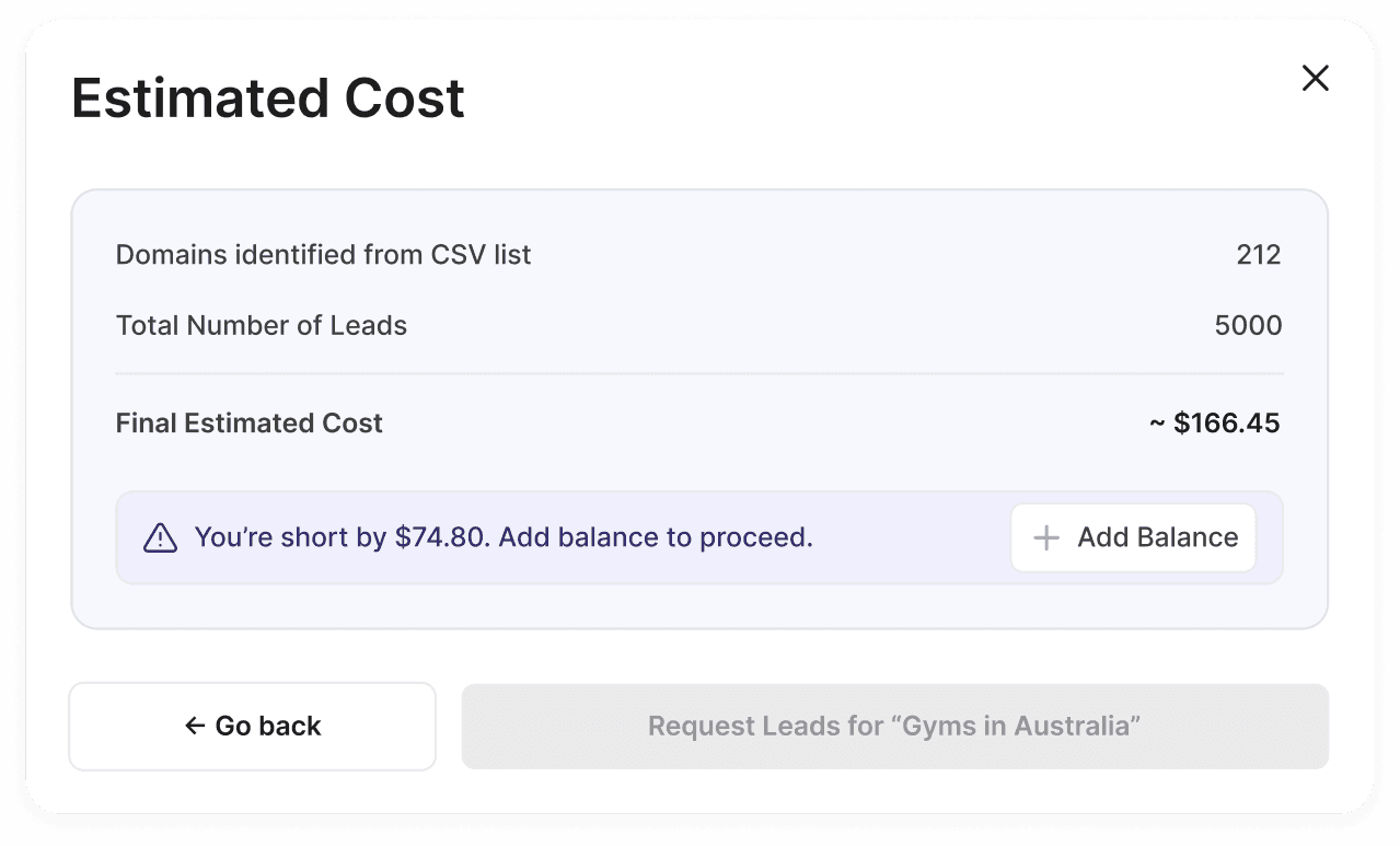 Before a user committed their request, the UI calculated a cost range based on their requested parameters (e.g., number of leads per company, specific AI models used).