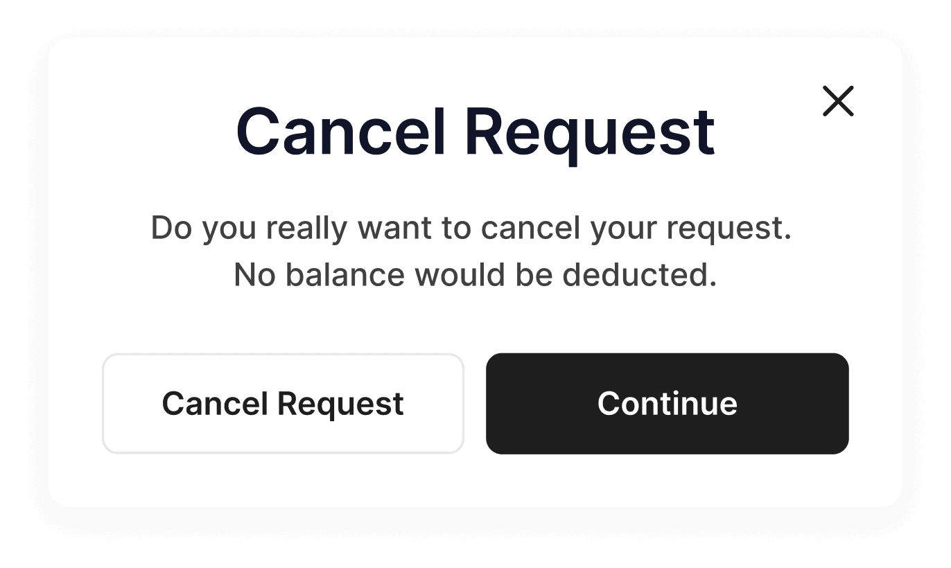 Abandonment Confirmation: If a user tried to cancel a request mid-flow, I added a confirmation modal that reassured them: "Your balance will not be deducted if you cancel now."